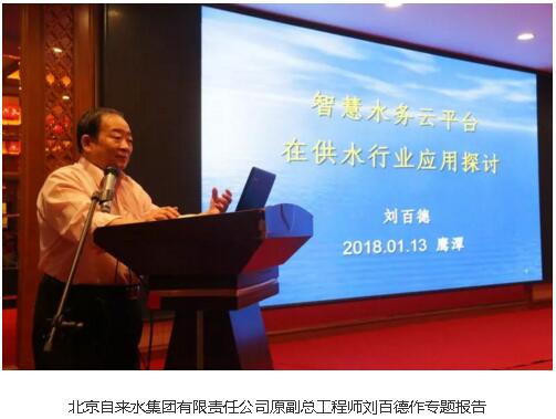 接下来会议进入正式研讨阶段。北京自来水集团有限责任公司原副总工程师刘百德首先发表关于“智慧水务云平台在供水行业应用探讨”的专题报告。刘总工的报告从智慧水务的概念、智慧水务信息化技术应用发展概况等方面对智慧水务云平台在供水行业的应用做了研究和探讨。华为技术有限公司上海研究所蜂窝物联网产品线副总经理刁志峰以“NB-IoT构建全链接价值世界”为题发表演讲,阐述了NB-IoT技术发展现状、产业前景及其社会价值。刁总指出,NB-IoT商用已成燎原之势,将为各行各业带来巨大商机,中国创新将引领全球物联发展。